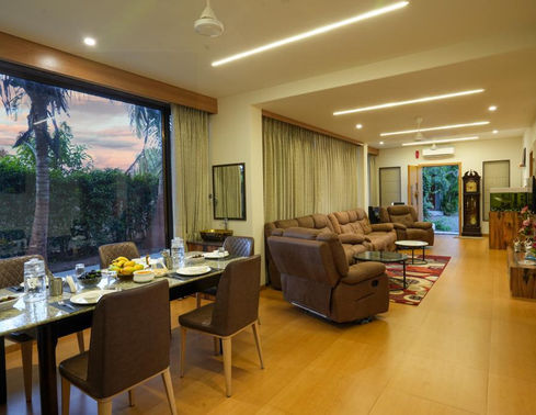 Surrounded by a lush 1-acre mango farm and tucked far away from the crowds, the villa features a cozy living area, tasteful interiors, a refreshing private pool, and a sprawling lawn—perfect for barefoot walks and starlit conversations. Whether you’re unwinding by the pool or simply soaking in the greenery, every moment here feels personal and unhurried.